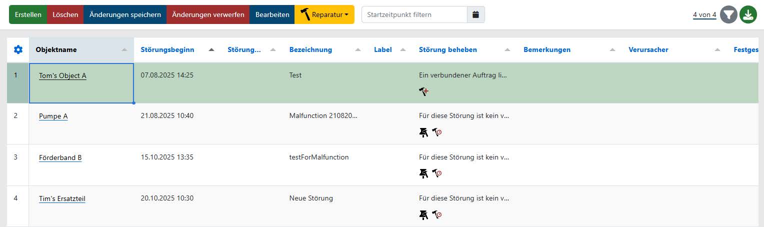 Auf der Störungsseite gibt es eine neue Spalte, die anzeigt, ob eine aktive Störung mit einemaktiven Reparaturauftrag verknüpft ist, wobei der Störungsdatensatz farblich hervorgehoben wird,wenn ein Reparaturauftrag aktiv ist. Zusätzlich kann der zugehörige Reparaturauftrag nun direkt ausdem Störungsdatensatz heraus angezeigt und ausgeführt werden.