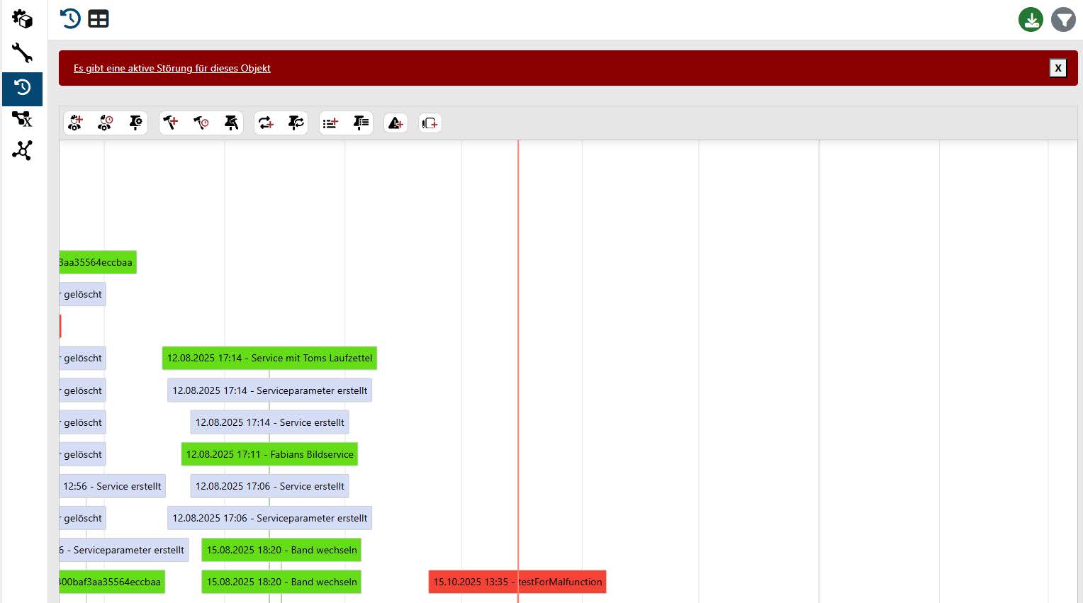 Angepinnte Meldungen weisen darauf hin, wenn ein Objekt mindestens eine aktive Störung hat.Diese Meldungen verlinken auf das Störungsfenster zur Interaktion. Das lässt sich z. B. auf demHistorien-Tab einer Objektseite mit aktiver Störung prüfen: Oben erscheint eine rote, angepinnteMeldung mit Link zum Fenster.
