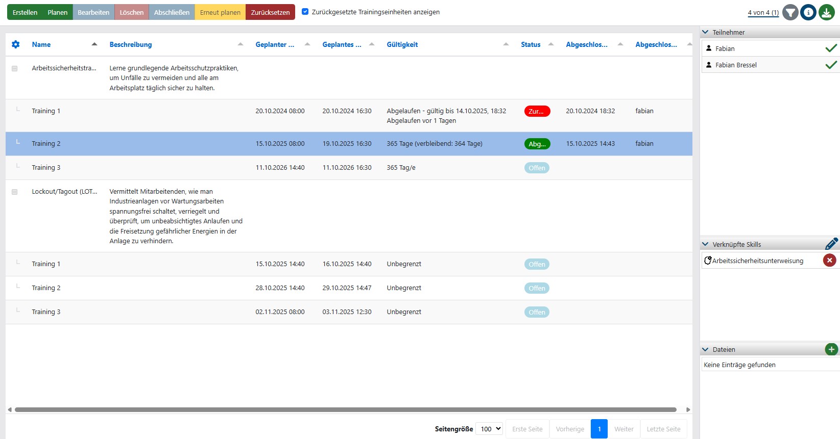 Sie können jetzt Trainingsdefinitionen erstellen und für jede Definition Trainingssitzungen planen,mehreren Mitarbeitenden zuweisen und eine Gültigkeitsdauer festlegen. Durch ein Trainingverliehene Skills werden automatisch widerrufen, wenn die Gültigkeit abläuft; sie können zudemjederzeit manuell zurückgesetzt werden. Für wiederkehrende Anforderungen können Sie einfrüheres Training in einem Schritt neu planen – inklusive Übernahme aller Teilnehmenden, derDurchführungszeit und der vorherigen Gültigkeitsdauer.