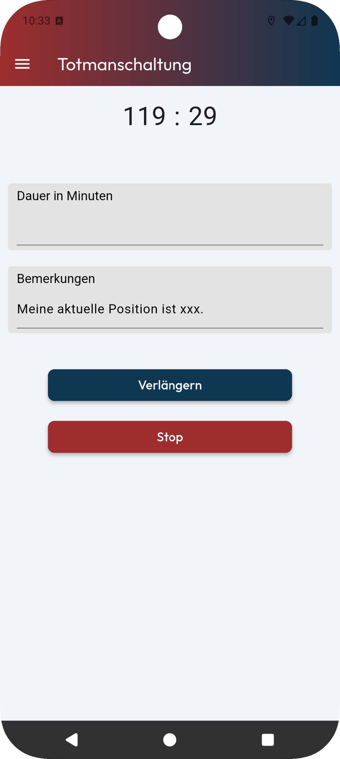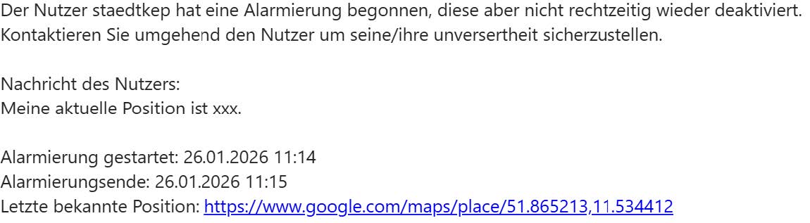 Beim Aktivieren einer Totmannschaltung müssen Sie nun zusätzlich zur ablaufenden Zeit eine Nachricht eingeben, die potenzielle Empfänger über Ihre Aufgabe informiert. Dieser Nachricht wird inkl. der letzten Standortdaten an die Empfänger der Totmannschaltung gesendet, wenn die Totmannschaltung abläuft. Dies stellt sicher, dass die Empfänger über die Situation informiert sind und entsprechend reagieren können.