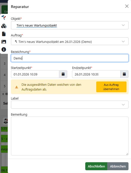 Bei allen Aufgaben müssen ein Start- und ein Endzeitpunkt angegeben werden. Bisher wurde das aktuelle Datum standardmäßig vorausgefüllt, wenn kein Auftrag vorhanden war, also bei einer Schnellwartung oder -reparatur. Bei einer regulären Wartung oder Reparatur mit Auftrag war dies jedoch nicht der Fall. Dort wurde das Datum der Aufgabe vorausgefüllt. Um einen einheitlicheren Ablauf zu gewährleisten, wird nun in allen Fällen das aktuelle Datum vorausgefüllt. Der Nutzer wird jedoch darauf hingewiesen, wenn sich das eingetragene Datum vom geplanten Datum der Aufgabeunterscheidet. Mit einem Klick können Sie das Datum auf das geplante Datum der Aufgabezurücksetzen.