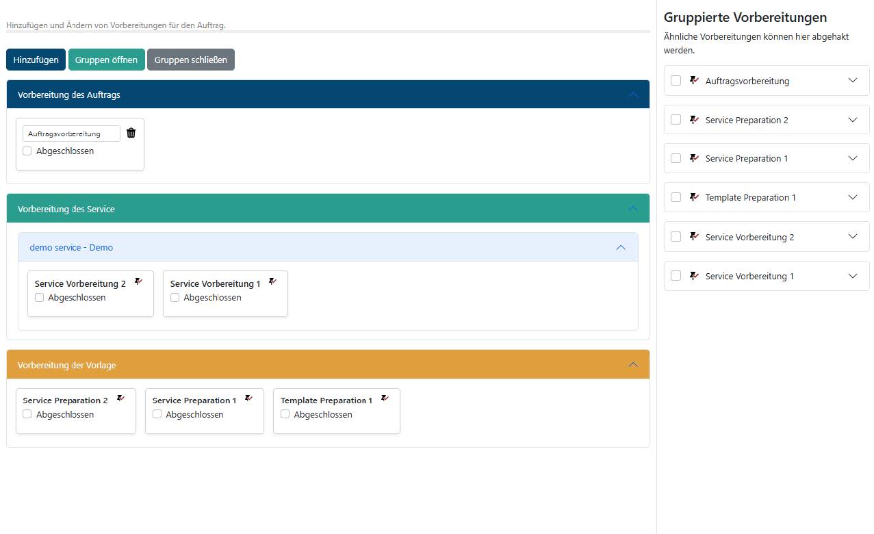 Services verfügen jetzt über die Möglichkeit, Vorbereitungen zu definieren. Diese werden bei der Planung von Aufgaben berücksichtigt, indem sie dem Auftrag automatisch hinzugefügt werden. Der Planer des Auftrags muss nun zunächst diese Vorbereitungen bestätigen, bevor die eigentliche Aufgabe ausgeführt werden kann. So wird sichergestellt, dass alle erforderlichen Schritte vor der Ausführung des Services abgeschlossen sind. Ein Auftrag kann erst dann ausgeführt werden, wenn alle Vorbereitungen abgeschlossen sind.